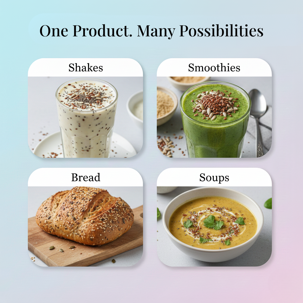The mix can be used in a variety of protein shakes, smoothies, bread, soups, marinades and dressings.