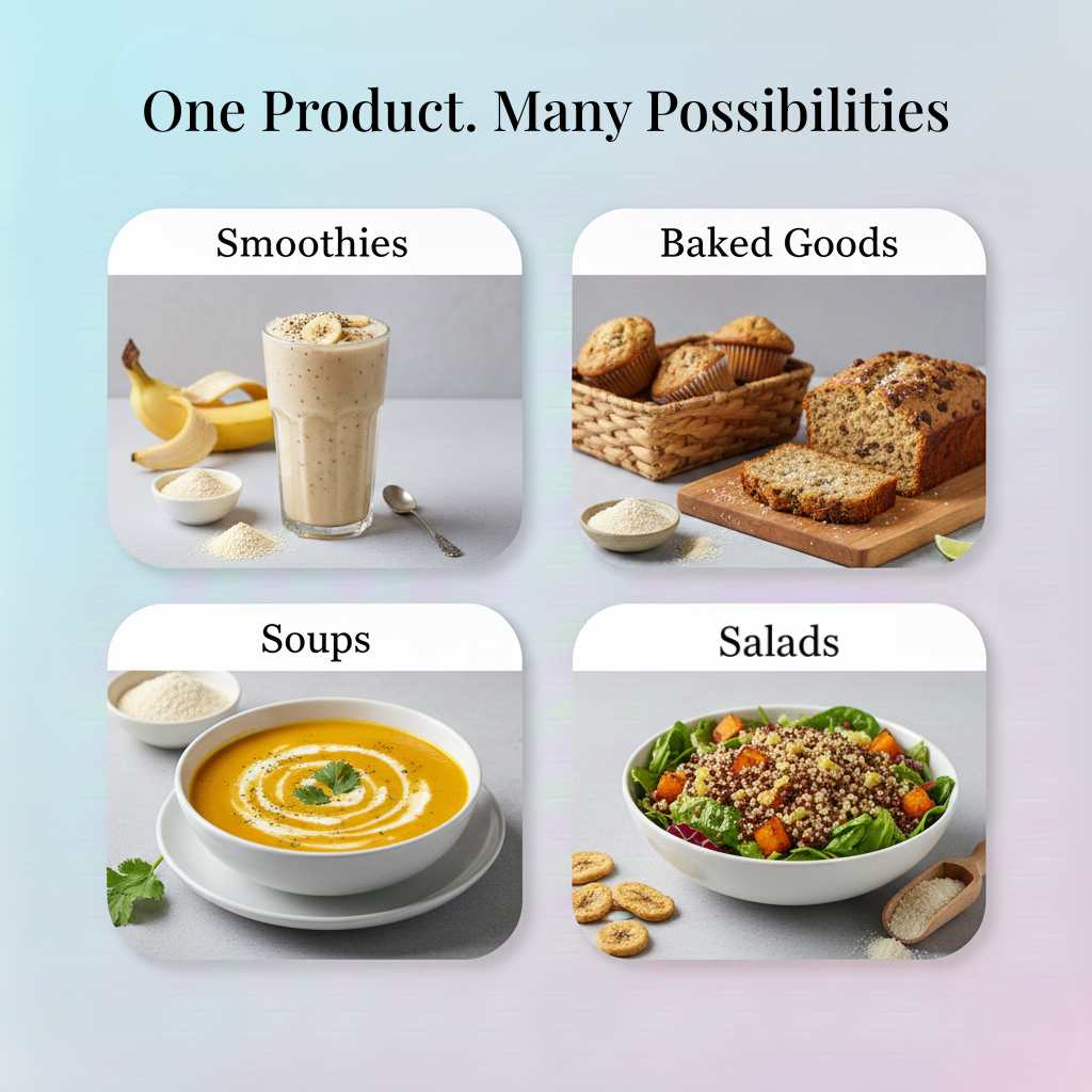 Banana Flour can be used in rotis, to thicken sauces and soups, baby foods, Indian farsan, bakery and confectionery products, sweets, ice-creams and smoothies.