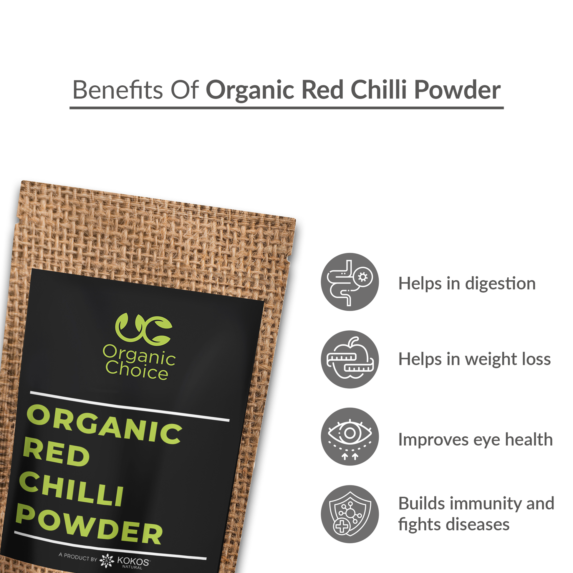 Immunity Boosting: Fight diseases & infections with Organic Choice Red Chilli Powder. Healthier You: Maintain bone strength, improve eye health & reduce blood pressure with our organic red chilli powder.