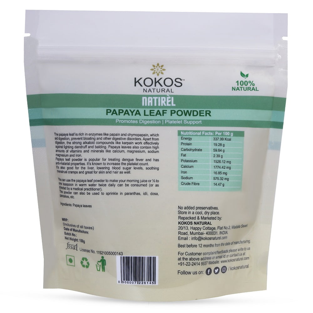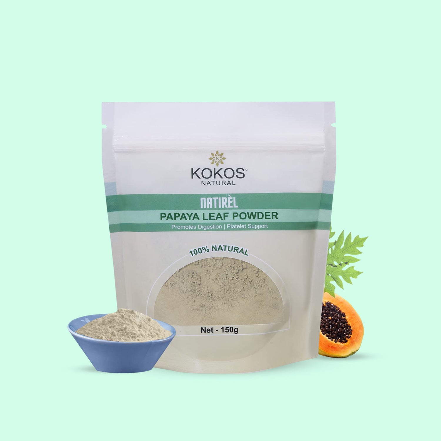 Papaya powder increases the platelet count, is good for the liver, lowers blood sugar levels, soothes menstrual cramps and is great for skin and hair as well.